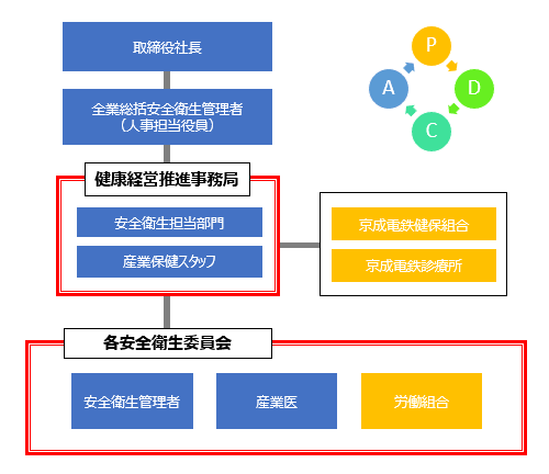京成電鉄健保組合や当社安全衛生担当部長を含めた連絡会議を月1回開催しています。特に健康診断や特定保健指導については密に連携し、従業員の健康の保持増進を双方が協力して進めています。